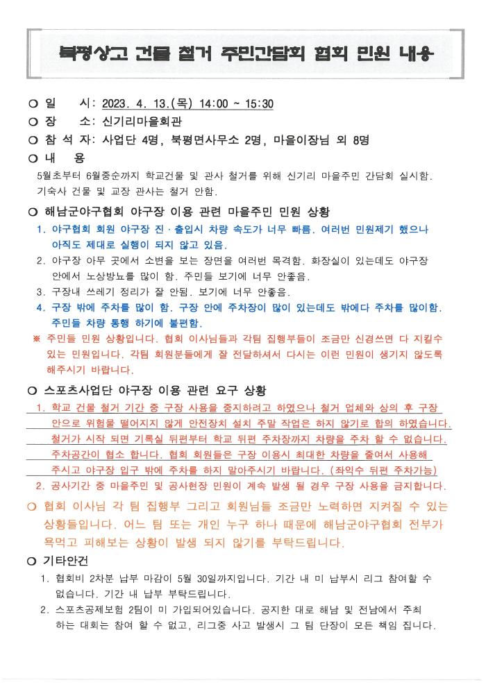 해남야구장 이용 관련 민원