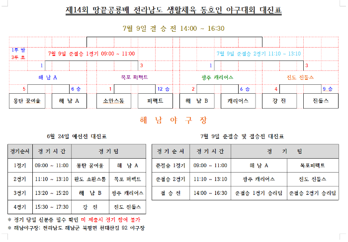 우천으로 중단되었던 땅끝배 결선 일정을 7월 9일 진행합니다. 해남리그는 다음으로 연기 되었습니다. 잔여일정은 홈페이지에 등록했습니다.