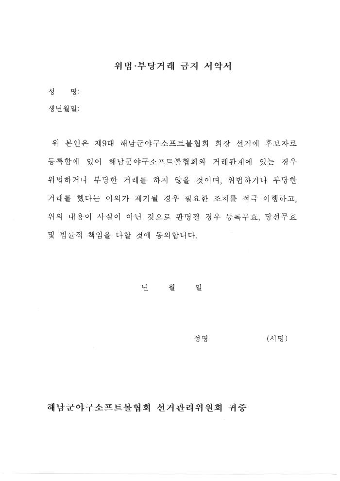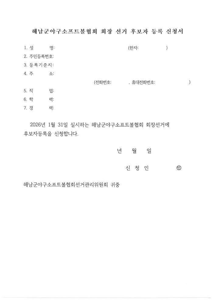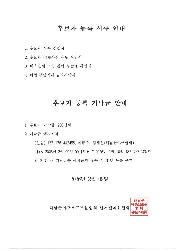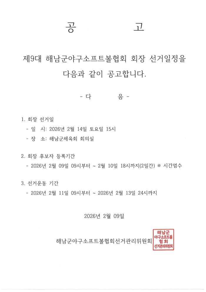 제9대 해남군야구소프트볼협회 회장 선거 재공고